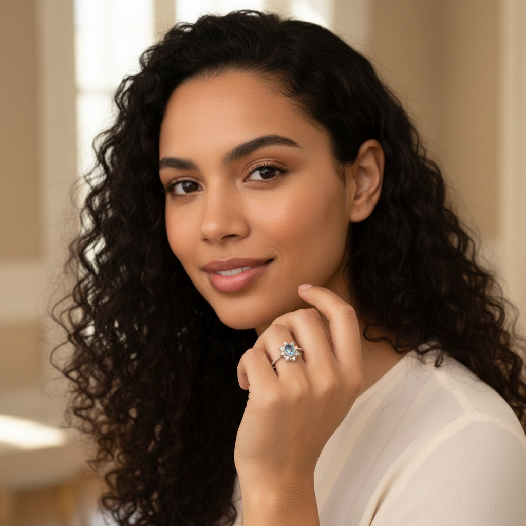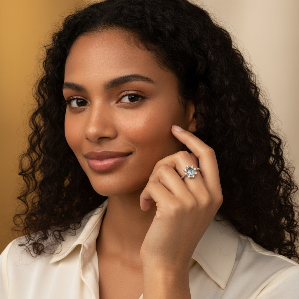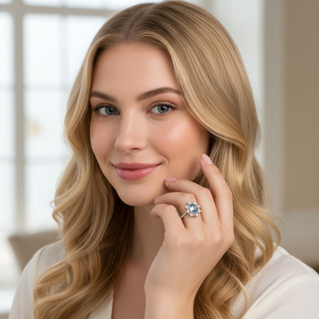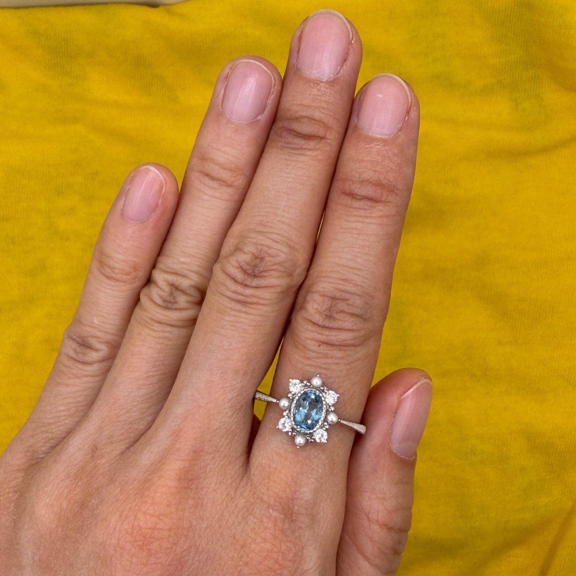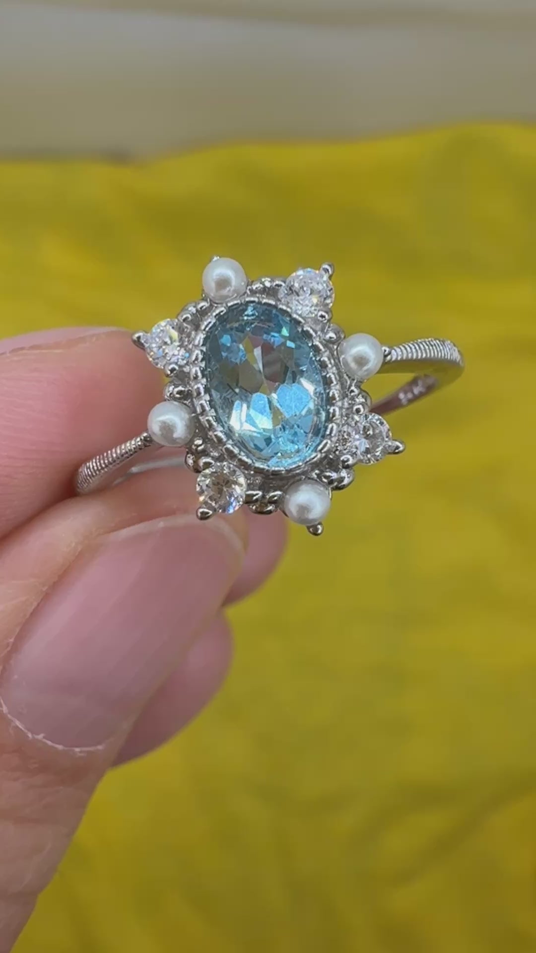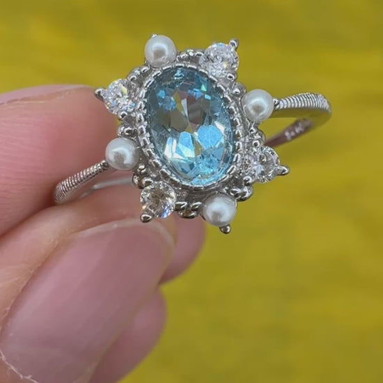 925 Sterling Silver Ring Oval 6x4mm Natural Blue Topaz Gemstone Zircon Pearl Women Bridal Jewelry Gift